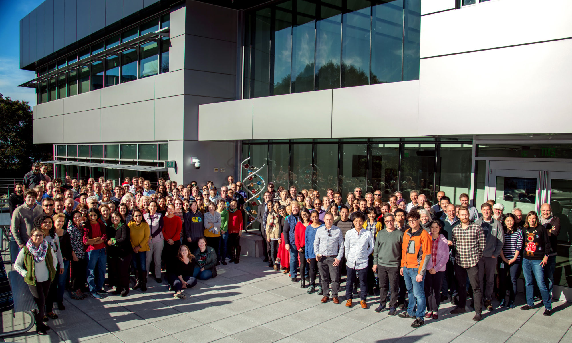 The new occupants of the Integrative Genomics Building (IGB) gathered outside their new digs on Monday as part of a “building warming” event, which included a welcome by Lab Director Mike Witherell, holiday treats, and games. Click to view a larger version of the photo. https://stratcomm-elements.lbl.gov/wp-content/uploads/sites/9/2019/12/IGB-group-shot-compressed-scaled.jpg