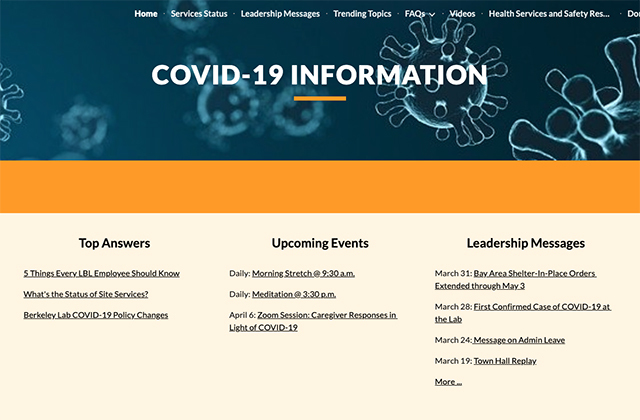 A new website has been developed that brings all the information from the existing website into an easy-to-use collection of information. You’ll find FAQs broken down by subject, a page of videos, all leadership messages, and a top section that provides the most recent information. https://covid.lbl.gov/home