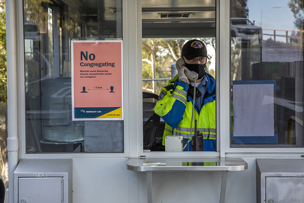 Among those helping to keep the Lab open for employees returning onsite to work is Derek Lope, shown here at the Blackberry Gate security booth. Things got a little busier for Lope at the beginning of July with the start of the Pilot 2a phase, which allowed 200 more employees to come onsite.
