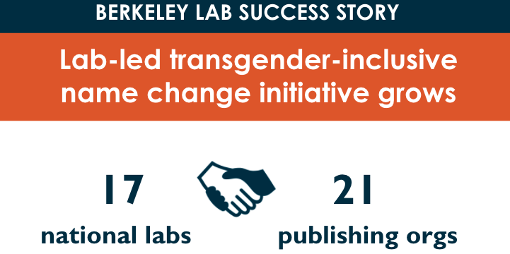 In a sea change for scientific publishing, a project led by Berkeley Lab has paved the way for researchers who change their names to retain recognition of their previously published work. Read about the initiative and how to initiate a name change request. https://research.lbl.gov/2021/10/06/inclusion-in-stem-lab-leads-transgender-inclusive-name-change-initiative/