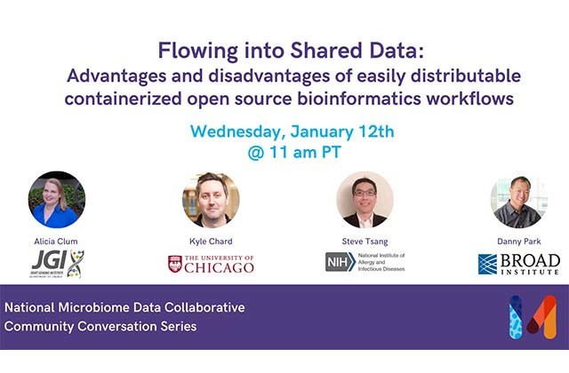 The NMDC’s January Community Conversation, scheduled for Jan. 12, is focused on how and why to use open source containerized bioinformatics workflows in microbiome research. The lineup of panelists promises an involved and lively discussion. https://lbnl.zoom.us/meeting/register/tJYodOmvpjwiGtEnjGwafOfnZ5BHcQoUBppr