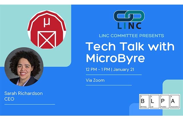 The Berkeley Lab Postdoc Association’s LINC Committee is excited to have MicroByre at January’s Tech Talk. MicroByre is changing the bioengineering landscape by domesticating non-model species into genetically tractable strains. Join Sarah Richardson, CEO and former Lab postdoc, today at noon. https://calendar.google.com/event?action=TEMPLATE&tmeid=NmFyOG8yNXRtM2hvdjlnNjhuc201Nm91bjUgbGJsLmdvdl9tcmsxZ2NrOG1rYnM4cGQ2b3YyNWZpMmk5a0Bn&tmsrc=lbl.gov_mrk1gck8mkbs8pd6ov25fi2i9k%40group.calendar.google.com