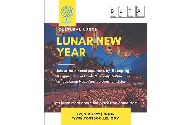 Join the Berkeley Lab Postdoc Association (BLPA) on Friday, Feb. 11, at noon, for an informal and interactive panel discussion between Huanping Huang, Miao Zhang, Geon Seok Lee, Qingyun Dan, and Yuzhong Liu on their respective lunar new year celebration traditions. https://calendar.google.com/calendar/u/0/r/eventedit/YWEwZG41MTUyMHM0ZmJvZG0xbTVkMWprNGMgbGJsLmdvdl9tcmsxZ2NrOG1rYnM4cGQ2b3YyNWZpMmk5a0Bn?tab=oc