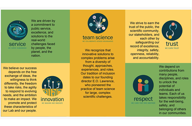 The Lab’s five core values: trust, innovation, service, respect, and team science, form the foundation of how we work at the Lab. Start a team conversation on how the core values are meaningful in day-to-day activities, and then share your thoughts at stewardship@lbl.gov. https://go.lbl.gov/corevaluestoolkit